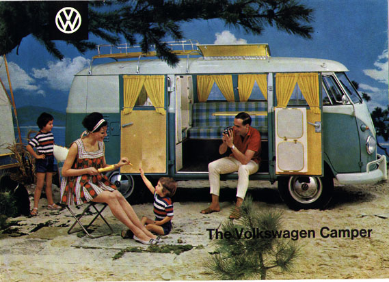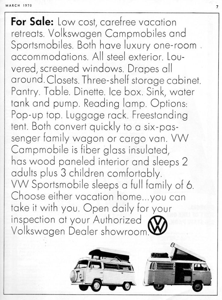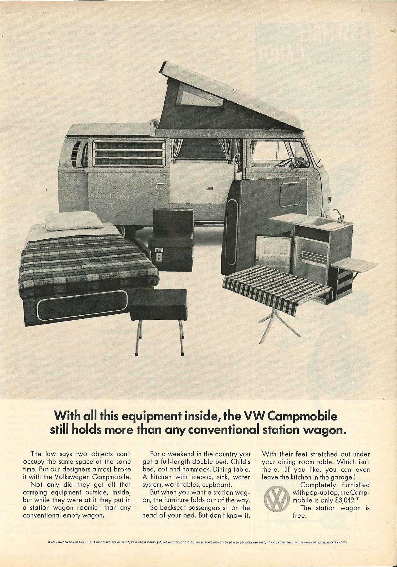 A 1972 ad. There's nothing like the great indoors. A fully equipped 1972 Volkswagen campmobile lets you feel at home in the great outdoors because it lets you bring along all the comforts at home. Curtains, reading lamps, paneled walls, closets, storage bins - just about everything there is. Even the kitchen sink. And the kitchen table, an icebox, and over four gallons of cool drinking water. They're all right there when you're ready to eat. When you're ready to sleep, there's a full size double bed for you, another bed & hammock for the kids. And lots of elbowroom. But if you want even more room, pop up the fibre glass top. Presto. A child's bedroom with cot and natural air conditioning.  For even more room, attach the tent to the side door and you've got a comfortable living room completewith floor. There's even something comforting about this year's 32% more powerful engine.  You can go 10mph faster, so you'll spend time less time driving and more time camping. At home, in the great outdoors.