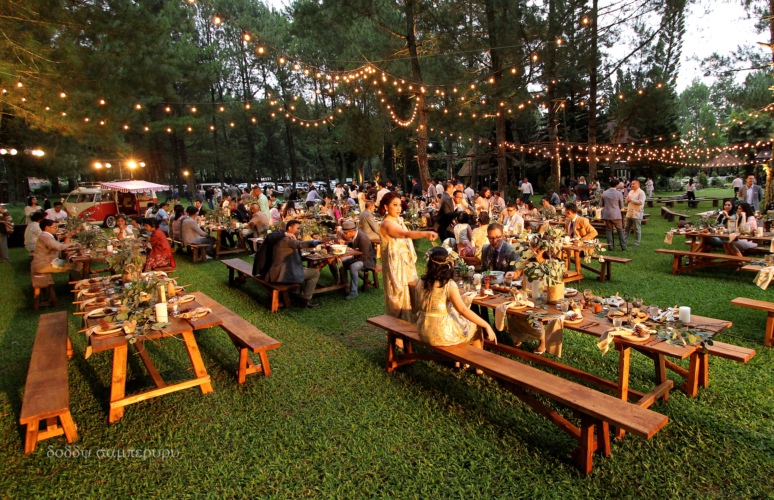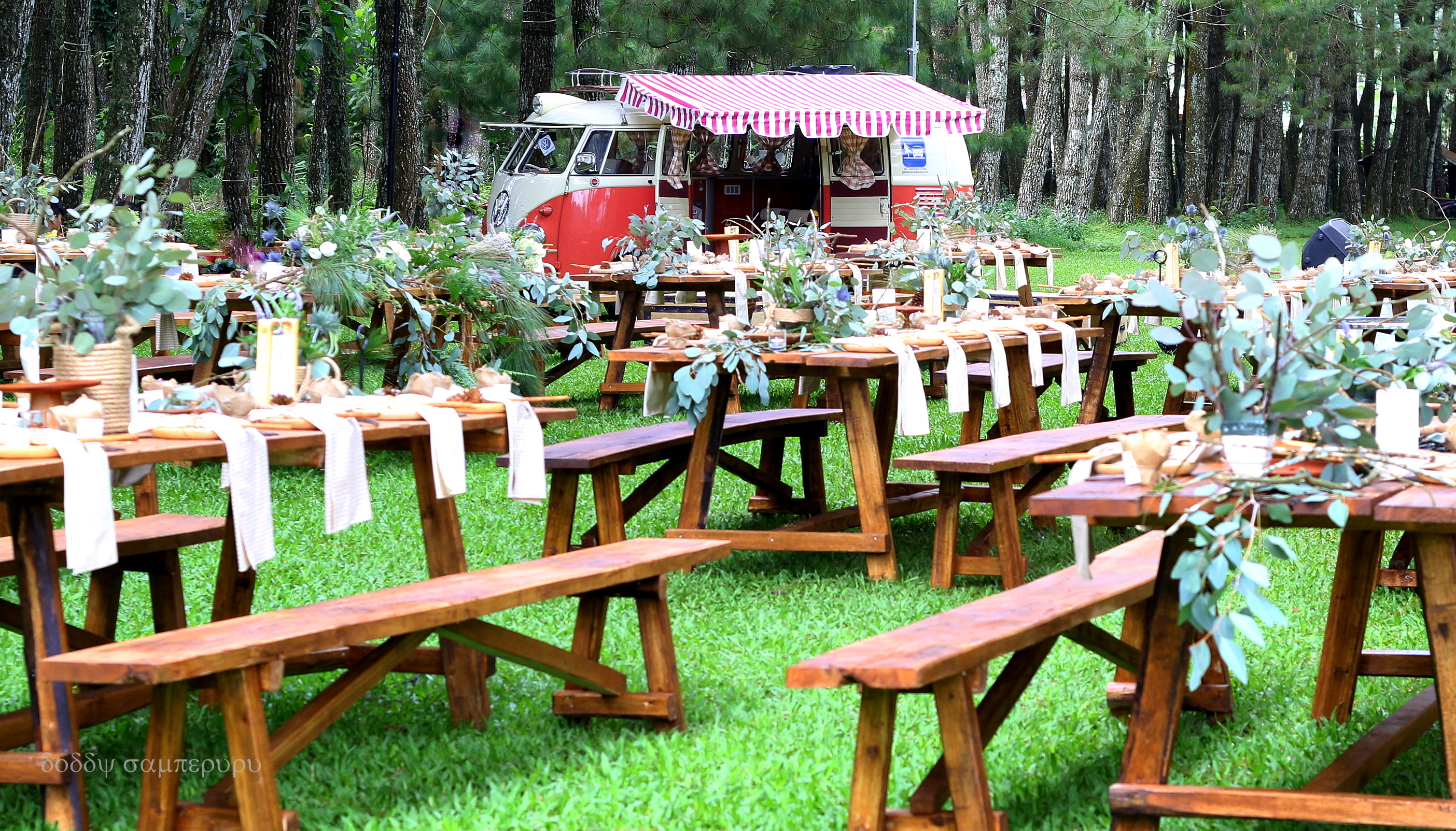 The full-decorated dining tables for invitees – limited to 200 guests only. The wooden tables & benches were freshly fabricated locally in Bandung for the wedding event…