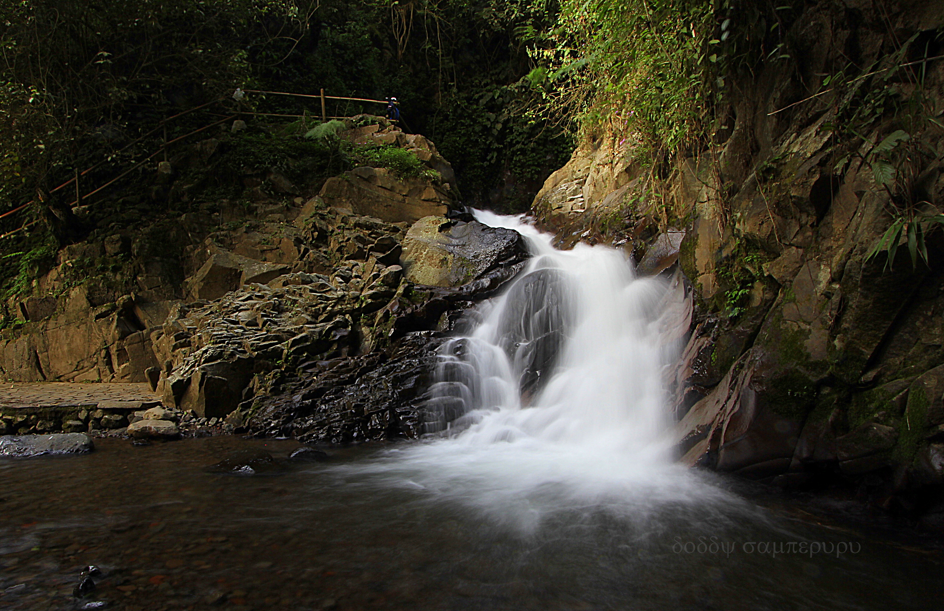 Walk further uphill about 300m to reach the most upstream waterfalls; the most spectacular ones, the 1st waterfall. Yes, actually there are two water falls in one location & to distinguish them, let me call it Curug Karembong top & Curug Karembong bottom (Karembong = scarf). I call it the most spectacular one due to the contour of the rock walls shaped from different layers of volcanic rocks. If you are brave enough, you can try to climb up the walls. If you are strong enough, you can take a shower beneath the top waterfall one, at least 30m tall, letting your body & head get stomped by the falling water. The water is cold & the wind draft will make it even colder.