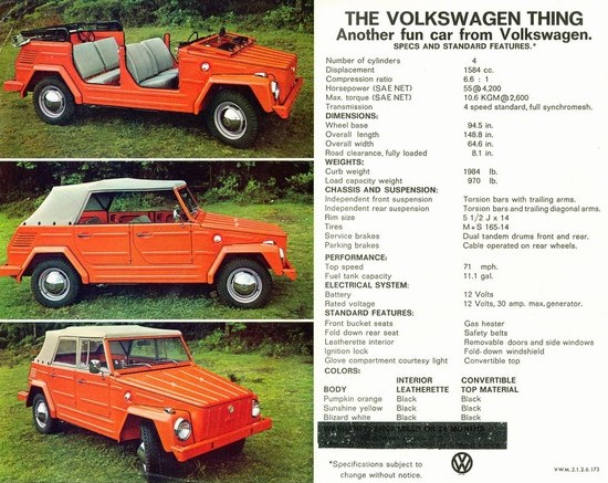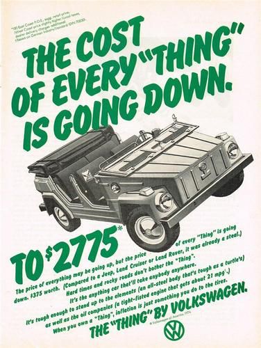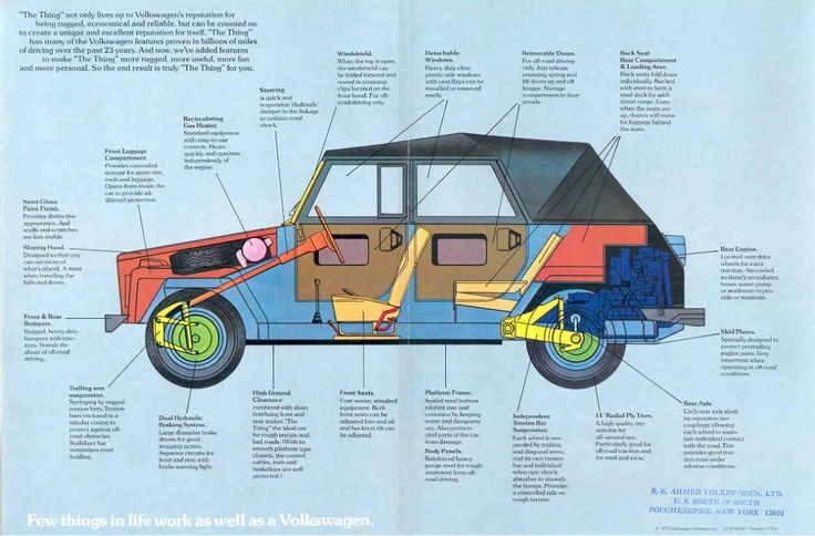 Anda akan tahu bahwa sebuah perusahaan mobil sedang mengalami masalah inovasi ketika mereka menyebut sebuah produk baru mereka hanya dengan nama “The Thing’ (yaitu ‘Anu’ atau ‘Sesuatu’). Itulah nama yang diberikan oleh Volkswagen ke produk turunan dari model Kübelwagen mereka, produksi tahun 1969-1983, ketika mulai masuk ke Amerika Serikat. Di tempat lain, namanya macam-macam, semisal – ambil nafas dalam-dalam dulu – Mehrzweckfahrzeug/Kurierwagen (Jerman), Camat (Indonesia), Safari (Mexico) dan The Trekker (di Inggris, tahun 1975). Meskipun begitu, nama ‘The Thing’ lebih banyak dipakai di dalam katalog Volkswagen.