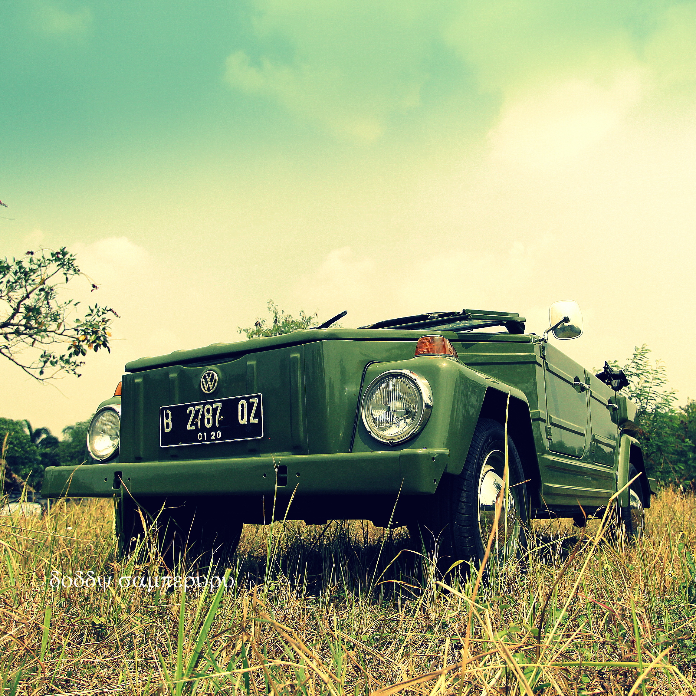 A file photo of an Indonesian Army soldier (wearing civilian) with a VW Safari. No information regarding place & date but estimated in 1972-73 – Foto prajurit TNI-AD (dengan pakaian sipil) di depan kendaraan dinas jeep VW Safari. Tidak ada keterangan tempat dan kapan foto ini dibuat, diperkirakan antara sekitar tahun 1972 dan 1973.